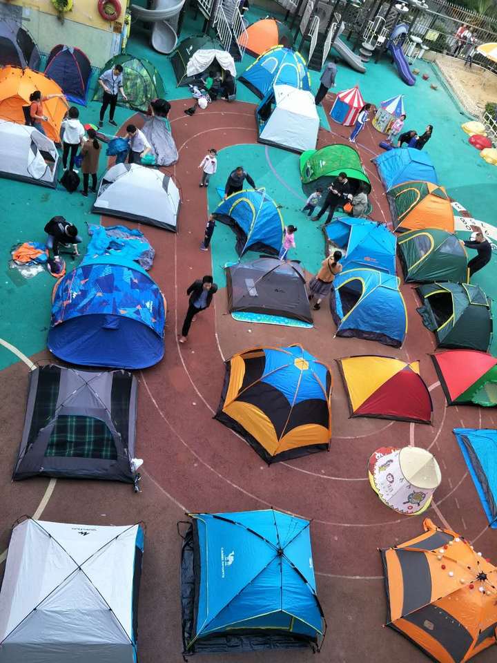 下午4点00分左右,家长们陆陆续续带着自家的帐篷来到幼儿园,迫不及待地开始互相交谈如何搭建,如何安置,他们更胜孩子般地期待着今晚亲子阅读的开始。