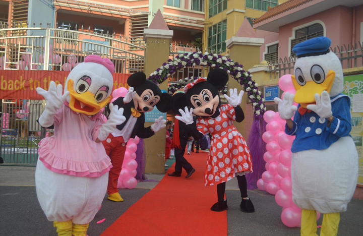 7:30开学典礼就正式开始啦!在老师们、卡通人物的迎接下,家长与宝宝们伴随着欢快的音乐,快乐的欢呼起来;用互动的方式开启了一系列的环节: