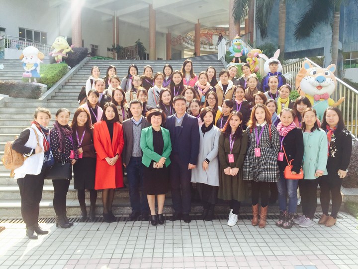 时间: 2016-12-31 作者:yuanhengjia 阅读次数: 366812月30日上午,踏着清晨的露滴,迎着清凉的北风,和暖的冬日阳光一路照射着这群追逐幼教事业的深圳市学前教育“苗圃工程”骨干教师研修班的全体学员来到东莞!公明二幼教学园长谭伟橙、教学主任陈丽芬也参加了此次培训班,在深圳大学副院长唐国良教授及杨建老师的带领下,首先来到了东莞市虎门东方明珠幼儿园实践观摩,幼儿园占地面积一万多平米,环境优美、空間宽敞、芳草茵茵、悦目怡人,以“美化、绿化,教育化、儿童化”为目标,老师们的亲切热情,孩子们天真活泼,让我们充分感受到园所的文化与特色;户外体育大循环,把幼儿园的户外场地运用得淋淋尽致,老师与孩子们在绿草茵茵的草地上走、跑、跳、爬、钻的体能训练,让孩子们真正尽情的拥抱自然,充分感受户外活动的乐趣,练就强健的体格,老师、孩子们统一的粉色园服融为一体,在运动场地上是一道青春亮丽的风景。