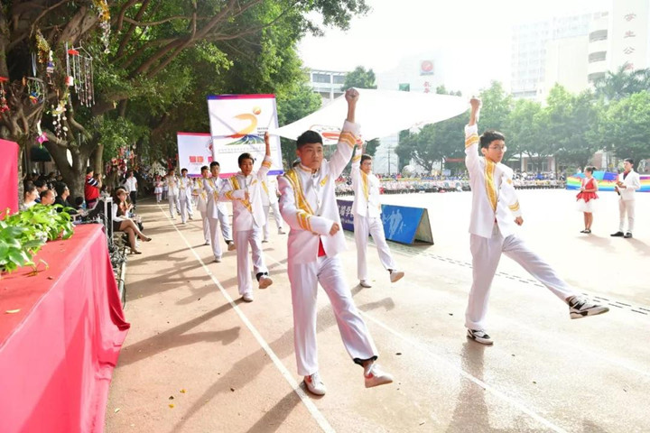 首先进行的是队列式表演,小学、初中、高中等70多个方阵鱼贯入场,一时运动场上形成了一道由色彩鲜艳的服装和绚丽多彩的道具组成的靓丽风景,学生们步伐矫健,口号嘹亮,精神抖擞,走出了士气,走出了自信,赢得了家长和来宾的阵阵掌声。