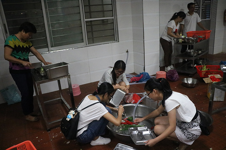 教师厨艺比赛是公明中英文学校建设幸福校园,活跃教职工业余生活的一项举措。活动将全校教师分成六个组,每组给予一定的经费,食材自行购买,要求每组各出16个菜,其中4个菜参加评分,其余的菜参与交流。活动当天正好是运动会,老师们得以有时间到市场精选食材。下午5点钟,运动会结束,学生全部离校后,老师们按照事先的分工有序的忙碌起来。洗菜、切菜、雕花、拼盘,平时温文尔雅的老师现在俨然一个个大厨,锅铲飞舞、菜色琳琅、满室顠香,各组选派的厨师们轮番上阵,一人一个自己的拿手好菜,“我心飞翔”、“青龙卧雪”,不但看得人垂涎欲滴,连名字都起得这么有意境。在另一个赛场,进行的是”刀工、嗑西瓜子、喝啤酒和蒙眼喂甜筒比赛,比赛规定,四个项目积分最后的一个组,全组组员要喝苦瓜汁。为了不让自己的组员出丑,场上队员尽力表现,场下组员呐喊助威,满脸的奶酪、对瓶吹啤酒的表情,嗨翻了全场。