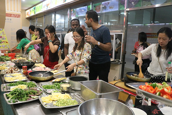 各组的美味佳肴摆上桌后,进入到评委打分环节,颜色是不是好看、味道是不是可口、造型是不是美观,三个厨房大佬认真评分,各组也高喊口号叫卖特色。而老师们早已按捺不住急切的心情,不等评委亮分,就跑到各组寻找美食,举杯畅饮,品味佳肴。(图、文/程俊)